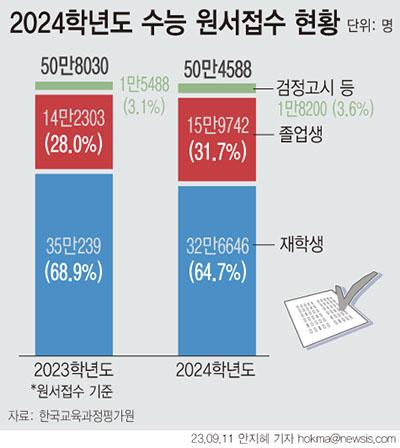 한국교육과정평가원(평가원)은 지난달 24일부터 9월8일까지 실시한 2024학년도 수능 응시원서 접수 결과, 수험생 총 50만4588명이 접수했다고 11일 밝혔다.