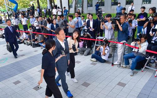 이후 다시 차량에 탑승한 후 청사 앞으로 이동한 이 대표는 자신을 지지하러 온 민두당 의원 10여명과 악수를 한 다음 포토라인에 섰다.