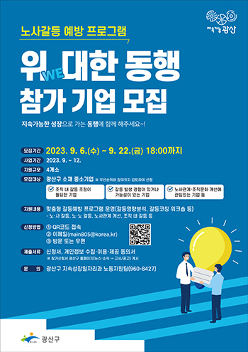 광산구에 소재한 중소기업 중 조직 내 갈등 조정이 필요한 기업, 갈등 발생 경험이 있는 기업, 노사관계 개선에 관심이 있는 기업 등을 대상으로 22일까지 참여기업을 모집한다.