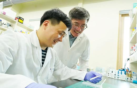 김민곤 교수(오른쪽)와 홍동구 연구원이 감염된 시약 샘플을 키트에 떨어뜨려 인플루엔자 신속항원진단 키트를 테스트하고 있다.