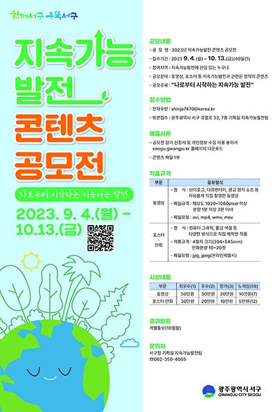 광주시 서구는 지속가능발전에 대한 주민들의 관심과 참여를 높이고자 다음달 13일까지 ‘지속가능발전 콘텐츠 공모전’을 진행한다.