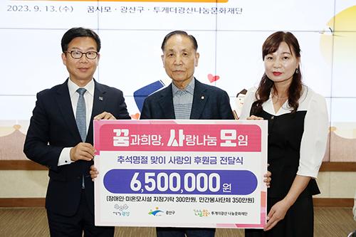 ‘꿈과희망, 사랑나눔모임(이하 꿈사모)’이 13일 민족 명절인 추석을 맞아 광산구 사회복지시설 등을 위한 후원금 650만 원을 투게더광산 나눔문화재단에 지정 기탁했다.