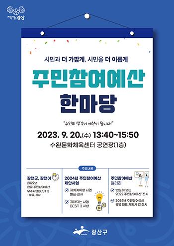 광주 광산구가 ‘시민과 더 가깝게, 시민을 더 이롭게’를 구호로 2023 광산구 주민참여예산 한마당 행사를 20일 수완문화체육센터에서 개최한다.