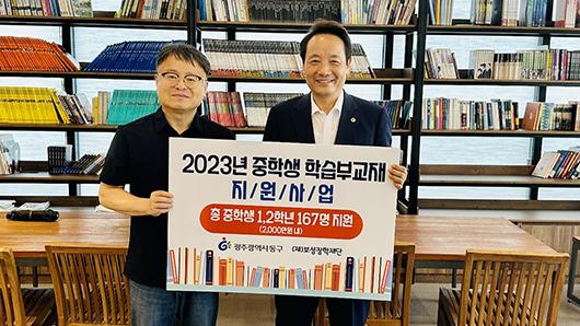 광주 동구는 관내 저소득 가정 중학생들의 학력 증진을 위해 (재)보성장학재단이 학습 교재 1000권(2000만 원 상당)을 후원하며 아이들의 꿈과 희망을 응원했다고 밝혔다.