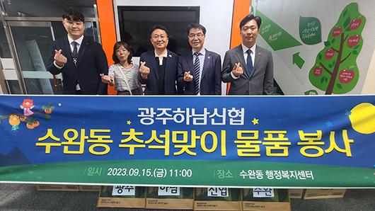 광주 광산구 수완동 소재 광주하남신협 수완지점 DT(수완동 1118번지)가 개점을 기념해 모은 150만 원 상당 후원금으로 수완동 돌봄 이웃의 따뜻한 추석 명절 나기를 지원했다.
