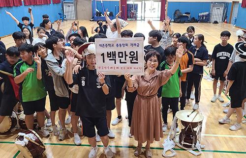 17일 대촌중에 따르면 이번 후원금은 대촌중 풍물동아리 56명 학생들의 간식비로 쓰였다. 풍물 연습에 매진하던 학생들은 이날 간식을 받으며 얼굴에 웃음꽃을 피웠다.
