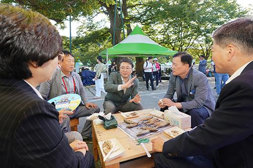 오기웅 중소벤처기업부 차관(가운데)이 지난 18일 전남 영광 \'제23회 영광 불갑사 상사화축제\'에 방문해 특산품 판매부스에서 굴비를 구입 후 관계자들과 시식하고 있다. /광주전남중기청 제공
