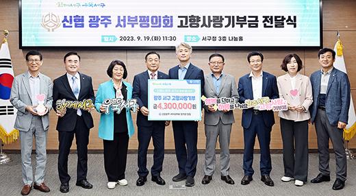 광주시 서구는 19일 서구청 나눔홀에서 신협광주 서부평의회 조합 임직원으로부터 고향사랑기부금 430만원을 기탁받았다.