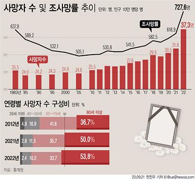 지난해 사망자가 37만명을 넘어서면서 3년 연속 역대 최대치를 갈아치웠다. 코로나19 오미크론의 확산과 인구 고령화의 영향으로 80세 이상 사망자가 전체의 과반을 차지했다.