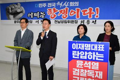더민주 광주전남 혁신회의는 25일 광주시의회 시민소통실에서 기자회견을 열고 입장문을 통해 \"윤석열 검찰독재를 끝장내고, 선장을 적진에 팔아먹고 기울어가는 배에 앉아 밥그릇 챙기기에 바쁜 모든 반민주, 반개혁 세력과 싸울 것\"이라며 항쟁을 선포했다.
