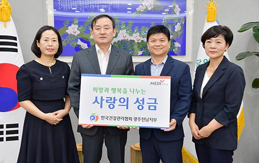 한국건강관리협회 광주전남지부는 지난 21일 담양군청을 방문하여 취약계층을 위한 희망 나눔 성금을 전달했다. 한국건강관리협회 광주전남지부는 성금 기탁 외에도 지역사회의 여러기관과 연계해 어려운 이웃에 대한 보건교육, 사회공헌 건강검진, 봉사활동 등 다양한 사회공헌활동에 힘쓰고 있다. /한국건강관리협회 광주전남지부 제공