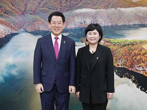 김영록 전남도지사가 25일 오전 도청 접견실에서 전남문화재단 신임 김은영 대표이사와 면담을 마친 뒤 기념촬영을 하고 있다. /전남도 제공