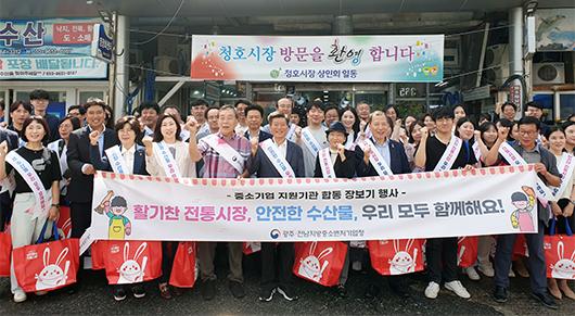 광주·전남지방중소벤처기업청(이하 광주·전남중기청)과 전라남도중소기업일자리경제진흥원(이하 전남경진원)은추석명절을 맞아 26일 목포 청호시장에서 전남신용보증재단, 소상공인시장진흥공단, 종소벤처기업진흥공단 전남지역본부 등 8개 중소기업 지원기관 임직원 80여 명과 추석명절 맞이 전통시장 장보기 행사 및 수산물 소비촉진 캠페인을 가졌다고 밝혔다. /광주전남중기청 제공
