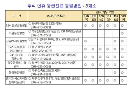 광주시는 추석 연휴기간인 28일부터 10월3일까지 동구 1·서구 1·남구 1·북구 3·광산구 2곳 등 모두 8곳의 동물병원이 응급 진료를 한다고 26일 밝혔다.