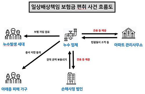 A씨는 보험 가입에 앞서 일어난 누수 피해도 가입 후 발생한 것처럼 꾸몄다. A씨는 누수 피해 발생으로 아래층 세대에 배상해줘야 할 입주민에 접근, 배상책임 보험부터 가입토록 권유했다.