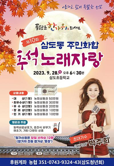유보선 삼도청년회 회장은 “4년 만에 노래자랑이 주민들의 도움으로 10번째 행사를 연다”며 “명절을 맞아 고향을 찾는 귀향객과 주민들이 함께 어울려 즐기는 특별한 행사가 되길 기대한다”고 말했다.