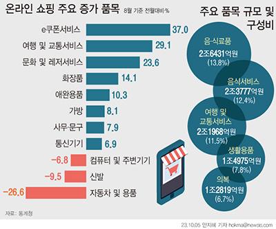 통계청이 5일 발표한 \'2023년 8월 온라인쇼핑 동향\'에 따르면 8월 온라인쇼핑 거래액은 19조1023억원으로 1년 전보다 6.1%(1조937억원) 늘었다. 지난 5월(19조2481억원)에 이어 역대 두 번째로 가장 큰 수치다.