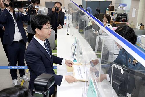박병규 광주 광산구청장이 10일 오전 광주 광산경찰서 민원인실에서 광산구시설관리공단 내 비위 의혹이 담긴 고발장을 제출하고 있다. /광주시 광산구 제공