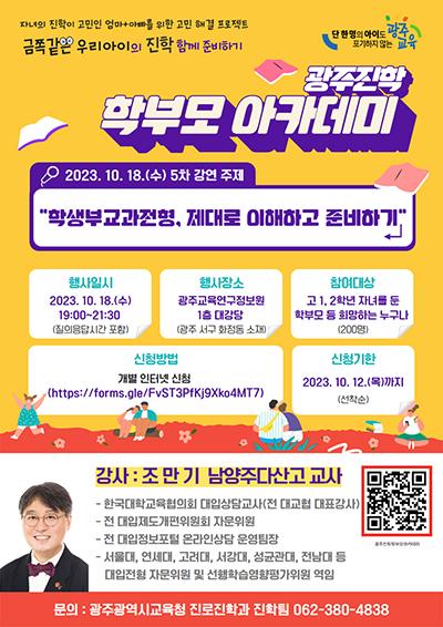 광주시교육청이 오는 18일 오후 7시 광주교육연구정보원 1층 대강당에서 ‘학생부교과전형, 제대로 이해하고 준비하기’를 주제로 제5차 광주진학 학부모 아카데미를 개최한다.