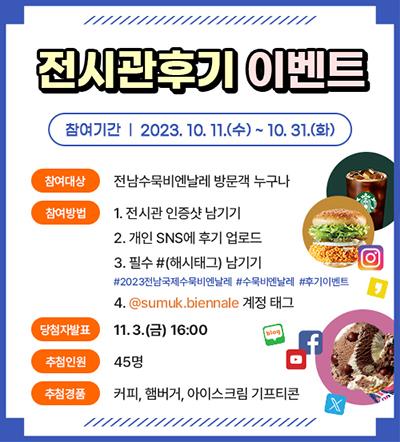 12일 사무국에 따르면 전시관 후기 이벤트는 개인 누리소통망에 전시관 관람(사진) 후기를 올리고 누리소통망 필수 해시태그(@sumuk.biennale, #2023 전남국제수묵비엔날레, #수묵비엔날레, #후기 이벤트)를 남기면 된다.