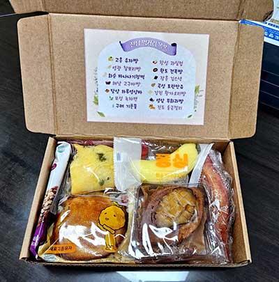 고흥 유자빵, 영광 찰보리빵, 화순 바나나기정떡(빵), 해남 고구마빵, 완도 전복빵, 강진 황가오리빵, 영암 무화과빵, 담양 하루영양바, 곡성 토란만쥬을 비롯해 장성 과일컵, 장흥 김스낵, 진도 울금젤리, 보성 녹차캔, 구례 기픈물 등 전남 대표 먹거리가 풍성하게 한데 담겨 있었다.