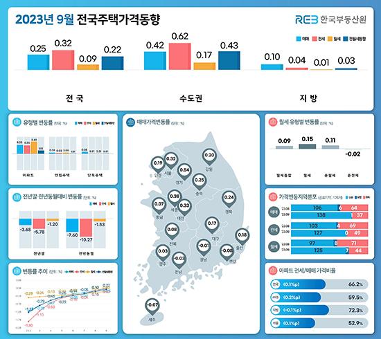 16일 한국부동산원에 발표한 ‘9월 전국주택가격동향조사’에 따르면 전국 주택종합(아파트·연립·단독주택 등) 가격은 0.25% 올라 전월(0.16%)보다 더 큰 폭으로 올랐다. 수도권(0.30%→0.42%), 서울(0.29%→0.32%), 지방(0.02%→0.10%) 모두 상승폭이 확대됐다.