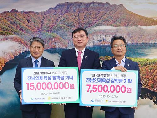 전남도는 19일 전남개발공사와 한국중부발전이 전남인재평생교육진흥원에 2250만 원의 인재육성 장학기금을 기탁했다고 밝혔다.