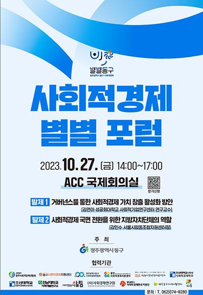 광주 동구는 오는 27일 국립아시아문화전당 국제회의실에서 사회적경제 생태계 구축과 지속 가능성 확보를 위한 ‘제1회 사회적경제 별별포럼’을 개최한다고 밝혔다.