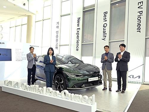 기아는 25일(수) 서울 서초구 세빛섬플로팅 아일랜드 컨벤션에서 기아 인증중고차 미디어 데이 ‘Movement to Trust(신뢰로 향하는 움직임)’를 개최하고, 내달 1일부터 자사 브랜드 중고차 매입 및 판매에 나선다고 밝혔다. 기아 국내사업본부장 권혁호 부사장(사진 오른쪽에서 두번째), 품질경영실장 김경철 상무(왼쪽에서 첫번째), 국내사업전략실장 김지민 상무(왼쪽 두번째), 국내CPO사업팀 이종혁 팀장(오른쪽 첫번째)이 EV6 인증중고차 앞에서 기념촬영을 하고 있는 모습. /기아 제공