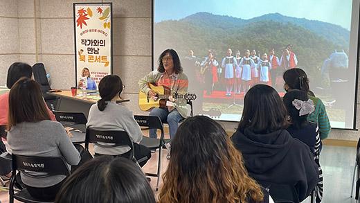 학부모들은 그림책 이야기와 함께 책 내용을 기반으로 김성범 작가가 작곡한 동요를 기타 연주와 함께 들으며 문학과 음악이 만나는 시간을 즐겼다.
