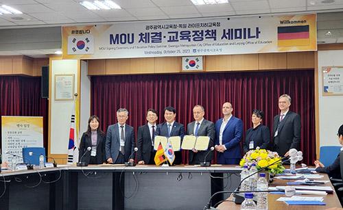 광주시교육청이 25일 광주를 방문한 독일 라이프치히 하이놀트(Heynoldt) 교육감과 미래교육 및 역사 경험 공유 등과 관련한 국제교육교류협력(MOU)를 체결하고 상호 명예교육감에 위촉했다고 밝혔다.