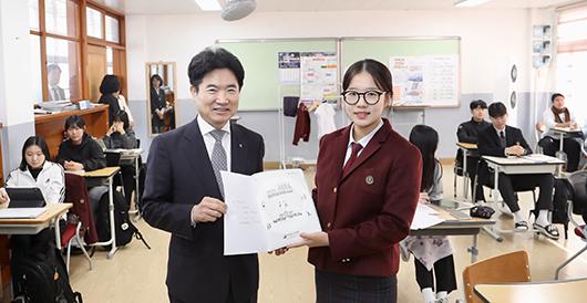 김대중 전남교육감이 곡성고 3학년 이소원 학생에게 ‘2024. 면접자료 정리해DREAM’을 전달하고 있다. /전남도교육청 제공