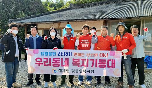 해제면 우리동네 복지기동대는 민관 협력봉사 단체로 취약계층 생활 불편을 해소하기 위한 ▲전등·수전 교체 등 소규모 수리 ▲청소, 도배장판, 창틀 교체, 보일러 수리, 장애인 편의시설 등 주거환경을 개선하고 복지 사각지대를 발굴하는 역할을 하고 있다.