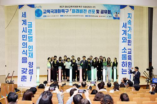 이날 행사는 월곡중학교 학생들의 K-POP 공연을 시작으로 이정선 교육감과 오영걸 광산부구청장의 인사말, 축사, 미래비전 선포 및 공유회 순으로 진행됐다. 특히 광산교육국제화특구 비전인 ‘세계시민의식을 갖춘 글로벌 인재 양성’을 알리고 핵심과제인 ▲세계시민교육 플랫폼 구축 ▲세계시민교육 ▲글로벌 교원 육성 ▲공존·상생의 글로컬 교육 등에 대한 설명이 있었다.
