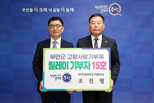 무안군은 고향사랑기부제의 성공적 안착을 위해 추진하고 있는‘무안군 고향사랑기부 릴레이’에 ㈜이룸바이오 조진형 대표이사가 15호로 참여해 따뜻한 응원을 전했다고 밝혔다.