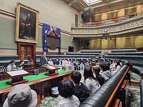 호주 글로벌 학생캠프에 여한 전남 학생들이 호주 뉴사우스웨일즈주 의회를 방문, 의회 관계자의 설명을 듣고 있다. /전남도교육청 제공