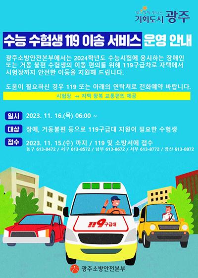 광주시소방안전본부는 오는 16일 2024학년도 대학수학능력시험 수험생 편의를 지원하기 위해 119이송 서비스를 제공한다고 1일 밝혔다.