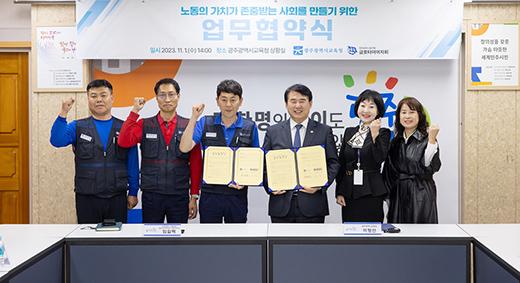 광주시교육청이 지난 1일 본청 상황실에서 전국금속 노동조합 금호타이어지회와 ‘노동의 가치가 존중받는 사회를 만들기 위한 업무 협약’을 체결했다.
