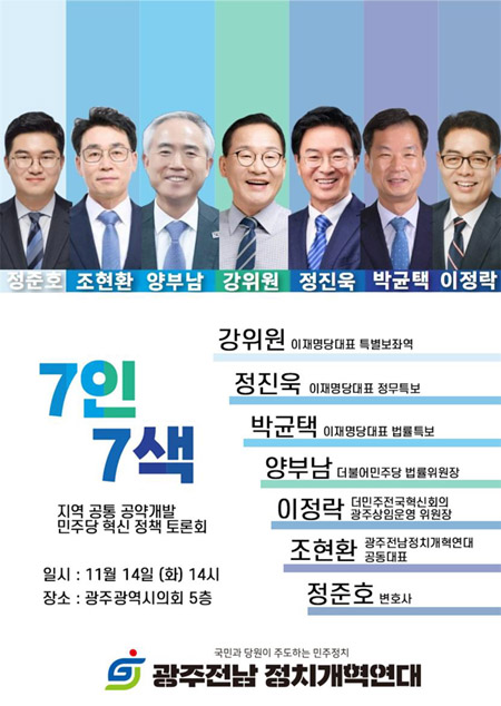 정치개혁연대는 또 \"7인7색 토론회를 통해 정치 신인들에게는 자신들의 이야기를 전할 공간을 마련하고, 정치 신인들과 함께 민주당 혁신에 대한 내용과 광주전남 발전을 위한 공통 공약 준비를 위해 이후에도 내용과 토론참여자들을 변경해 계속 개최할 것\"이라고 밝혔다.