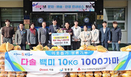 ㈜다솔은 지난 7일 저소득층 가정에 전해달라며 쌀 10kg 1000가마(2500만원 상당)를 장흥군에 기부했다.