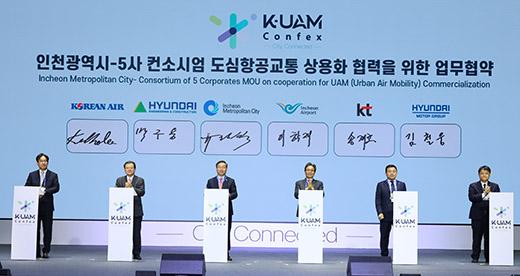 현대자동차는 국제 UAM 박람회 ‘2023 K-UAM 컨펙스(CONFEX)’가 개최된 영종도 파라다이스시티호텔에서 ‘K-UAM 원 팀’과 인천광역시가 ‘도심항공교통(UAM) 상용화 협력을 위한 업무협약(MOU)’을 체결했다고 9일 밝혔다. (우측부터) 현대자동차 AAM본부 김철웅 상무, KT 송재호 부사장, 인천국제공항공사 이학재 공사장, 유정복 인천시장, 현대건설 박구용 전무, 대한항공 이길호 상무. /현대차 제공