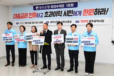 진보당 광주지역 총선 후보자들이 14일 \"광주은행은 대출금리를 내리고, 초과이익은 시민들에게 되돌려줄 것\"을 요구했다.