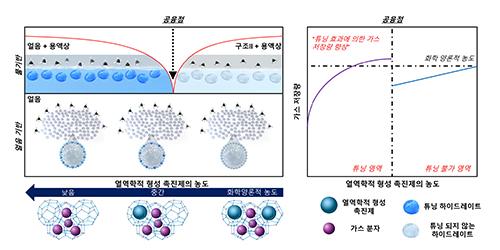 연구팀은 이를 해결하기 위해 열역학적 형성 촉진제의 농도를 선택적으로 조절해 하이드레이트의 나노 격자 공간 중 일부를 비우고 이를 가스 분자로 채우되, 열역학적 형성조건을 완화하며 가스 저장량을 향상시킬 수 있는 ‘튜닝 효과\'가 유용하게 활용될 수 있음을 제안했다.