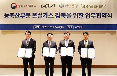 기아는 14일 오전 10시 서울 영등포구 63빌딩 사이프러스홀에서 농림축산식품부, 신한은행, ESG 스타트업 \'그리너리\'와 함께 농·축산 부문 온실가스 감축 가속화를 위한 4자간 업무 협약(MOU)을 체결했다.