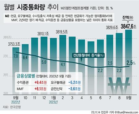 한국은행이 14일 발표한 \'2023년 9월 통화 및 유동성\'에 따르면 9월 M2(광의통화, 평잔)는 3847조6000억원으로 전월(3829조5000억원)에 비해 18조1000억원(0.5%) 증가했다.