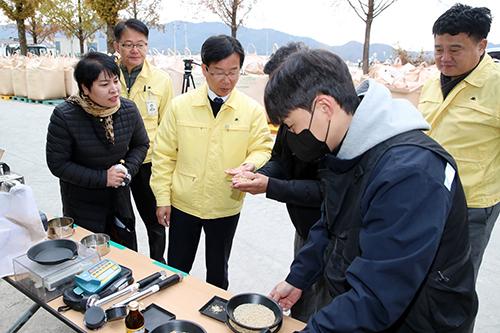 박병규 광산구청장이 14일 본량동 공공비축미곡 수매 현장인 남산 95호 창고를 방문해 출하 농업인과 농협, 농산물 품질관리원 등 관계자들을 격려했다.