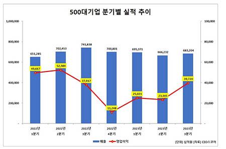 15일 기업데이터연구소 CEO스코어가 국내 매출 상위 500대 기업 중 지난 14일까지 분기보고서를 제출한 304개 기업의 올해 3분기 실적을 비교한 결과, 3분기 영업이익이 39조7201억원으로 집계됐다. 직전 분기와 비교해 16조3752억원(70.1%↑)이 늘었다.