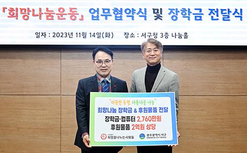 광주시 서구는 14일 서구청 나눔홀에서 (사)희망을나누는사람들과 ‘희망나눔 장학금 후원사업’ 업무 협약을 체결했다.