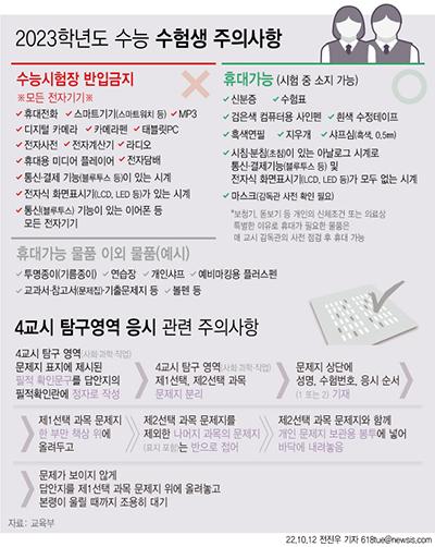 수능 당일에는 휴대전화, 스마트기기, 태블릿PC, 블루투스 이어폰, 전자담배, 전자사전, MP3 플레이어, 카메라펜, 전자계산기, 디지털 카메라 등 모든 전자기기에 대한 반입이 금지된다.