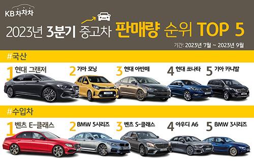 19일 KB캐피탈의 중고차 거래 플랫폼 KB차차차가 올 3분기에 판매된 중고차 판매량을 분석한 결과 국산차는 현대 그랜저, 수입차는 벤츠 E클래스가 가장 높은 판매량을 기록했다고 밝혔다.